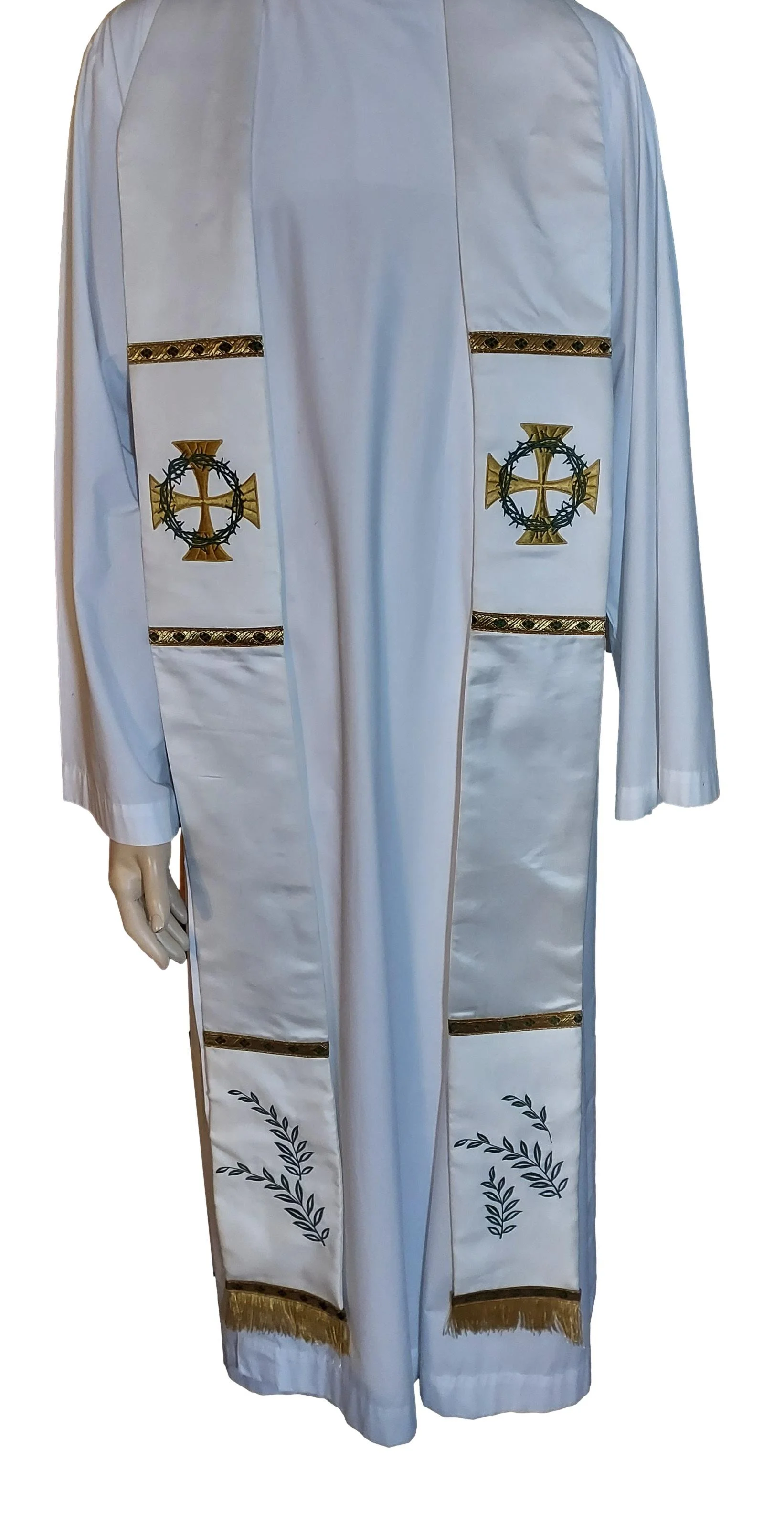 A stole made from a wedding gown. I was asked by a client to make stoles from her wedding gown which she wanted to put to good use after sitting in a box for many years. The gown was made from satin which I used for the length of the stole. The embroidery is on matte satin. Antique gold cross with crown of thorns embroidered over it. Olive branches embroidered on the bottom panels. She commissioned several which she is gifting to her priest friends.